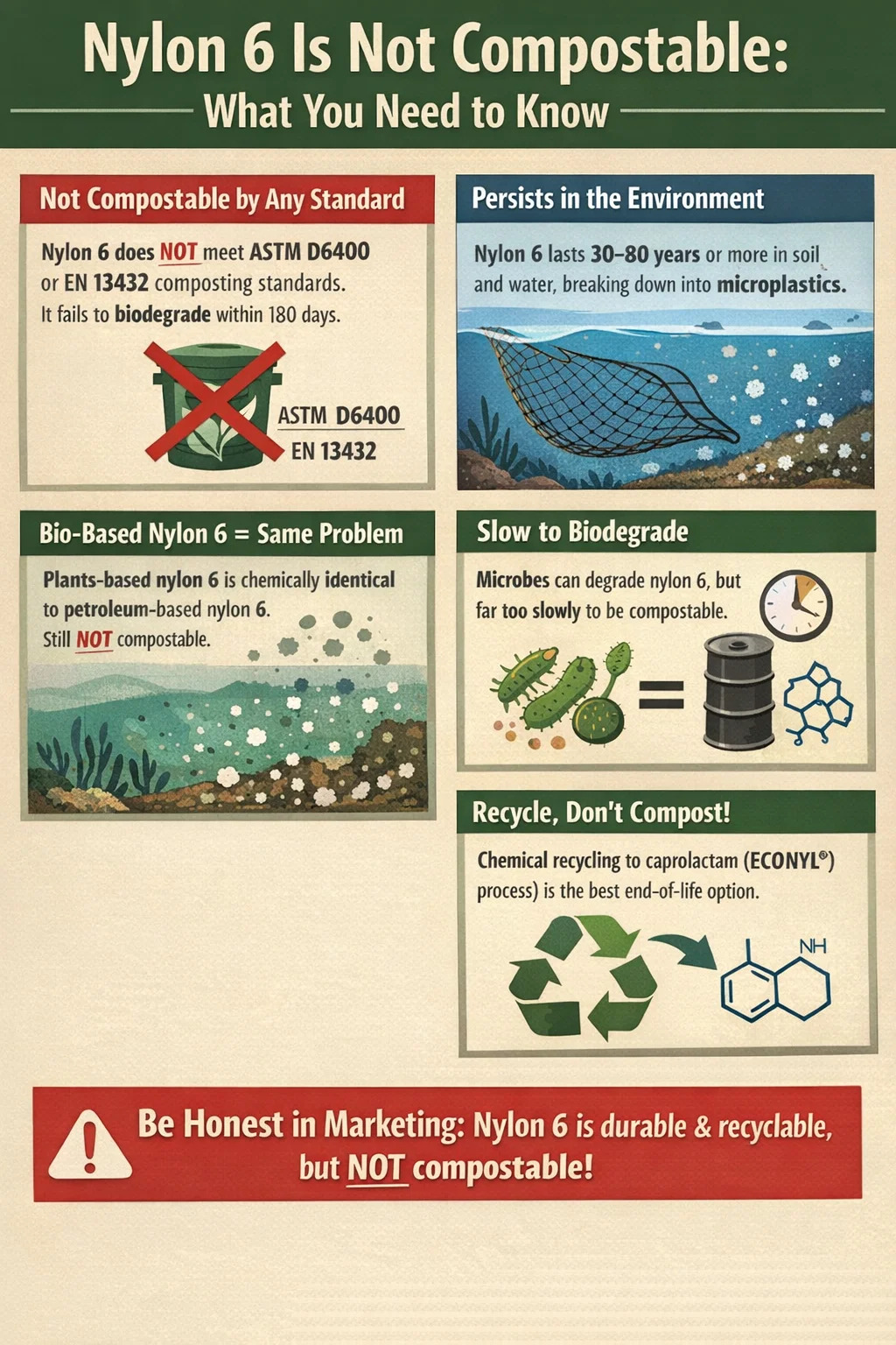 - El nailon 6 no es compostable bajo normas de compostaje doméstico o industrial (ASTM D6400, EN 13432). No cumple con los requisitos de tasa de biodegradación o desintegración.