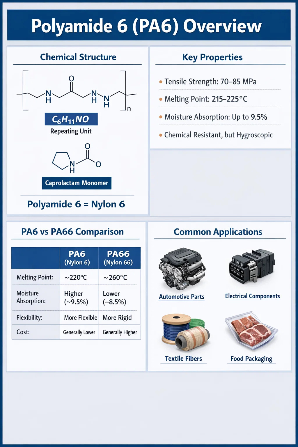 A nivel mundial, la poliamida 6 es uno de los termoplásticos de ingeniería más consumidos. El volumen de producción anual supera 4 millones de toneladas métricas , y el material es fundamental para industrias que van desde la automoción y la electrónica hasta los textiles y el envasado de alimentos. Comprender lo que significa PA6 es sólo el punto de partida: su química, sus características de rendimiento y su comportamiento de procesamiento definen por qué se ha vuelto tan dominante comercialmente.