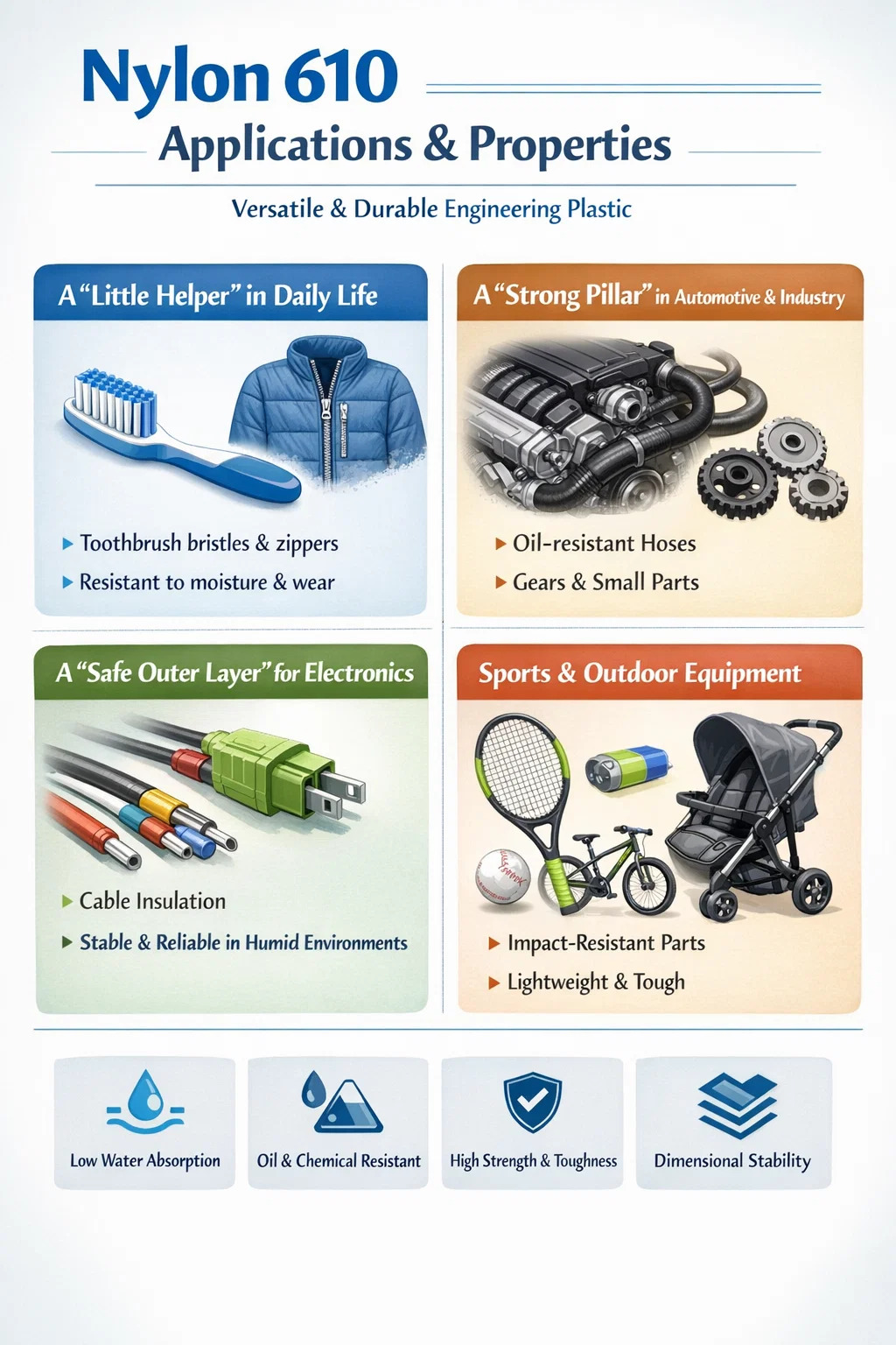 Cepillos y fibras: las cerdas de su cepillo de dientes y las cremalleras de su ropa suelen estar hechas de nailon 610. En comparación con los normales Nailon 6 , funciona mejor en ambientes húmedos, es menos propenso a la absorción de agua y a la deformación, y las cerdas mantienen su elasticidad incluso después de un uso prolongado, evitando que se vuelvan suaves y flácidas.