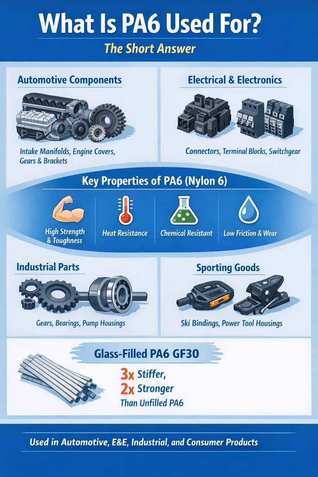 Antes de profundizar en aplicaciones específicas, es útil comprender por qué se elige PA6 en primer lugar. Su perfil inmobiliario es genuinamente equilibrado: no sobresale en un área a expensas de todo lo demás, que es lo que lo hace tan ampliamente aplicable.