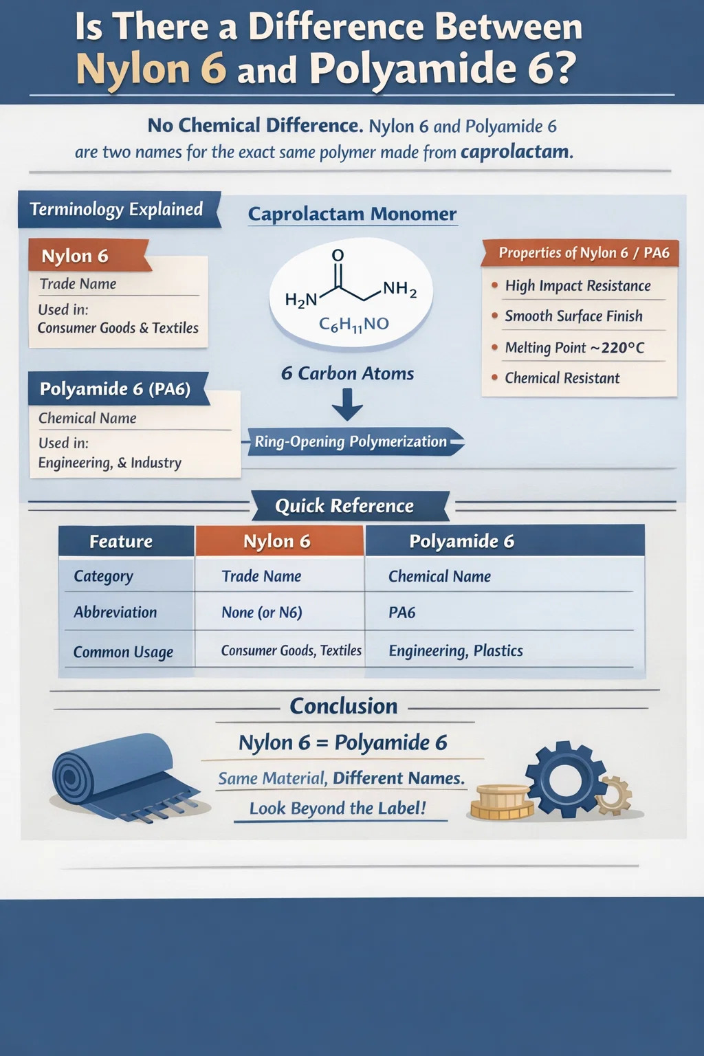 En pocas palabras: No existe diferencia química entre el nailon 6 y la poliamida 6. Son dos nombres diferentes para exactamente el mismo polímero. "Nylon" es el conocido nombre comercial acuñado oiginalmente por DuPont, mientras que "Poliamida" es el nombre químico formal utilizado en ciencia e ingeniería. cuando veas Nailon 6 en la etiqueta de un producto de consumo y Poliamida 6 en una ficha técnica se refieren al mismo material elaborado a partir de monómeros de caprolactamaa.